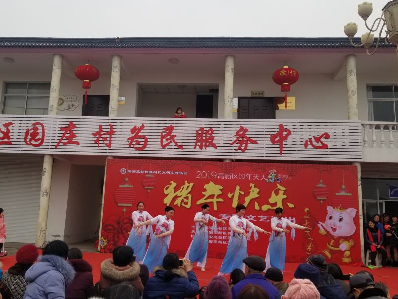 2月5日下午,"猪年快乐"专题文艺演出在园庄村文体广场举行。演出在舞蹈《丰收中国》中拉开了序幕,舞出了春节的欢乐、喜庆的氛围,赢得了观众阵阵掌声。