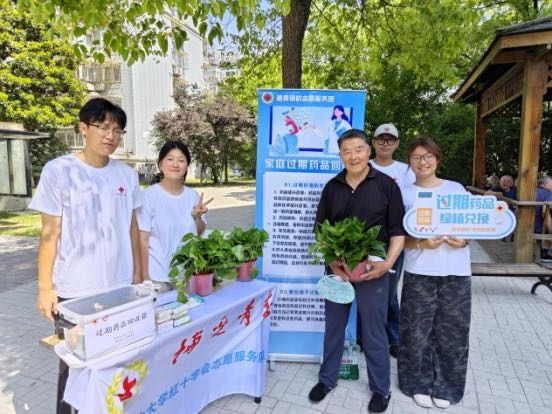 在药事服务过程中,志愿者发现了一个触目惊心的现象:许多老人家中堆放着大量过期药品——有的药盒发霉变色,有的说明书早已模糊不清,甚至有老人误将过期药当作“备用药”长期存放。乱扔过期药不仅会造成严重的环境污染,还有可能流入到不法商贩或不法医疗机构手中,一旦转卖给农村等偏远地区的病人,将给患者治疗带来难以预计的后果。为此,团队与崇川区市场监督管理局深度合作,链接上海华氏大药房连锁药店为“过期药回收驿站”,在社区发起“绿植换旧药”行动,普及过期药品危害及回收知识。志愿者用一株株绿意盎然的植物,换回一份份沉甸甸的安全承诺。这场从社区药箱到专业药房的旅程,不仅解决了困扰千万家庭的过期药难题,更探索出一条“政府监管+企业担当+社会参与”的可持续发展之路。团队志愿者感慨道:“我们守护的不仅是药箱里的安全,更是人与药、人与环境、人与未来的和解之道。”