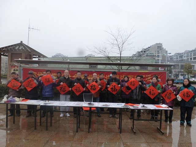 2016年1月17日南通市开发区社会事业局组织开发区书法艺术联谊会来到新开街道通盛社区举办 “猴年行好运 送福进万家”志愿者活动。开发区书法艺术联谊会会长张培杨、倪峰等为社区居民现场泼墨送“福”。书法家志愿者们来到社区广场,一刻没休息,就开始和工作人员为居民书写“福”字和春联,虽然天气寒冷,依旧挡不住居民参加活动的热情,不一会儿的工夫,前来参加活动的居民就把活动现场挤了个严严实实。