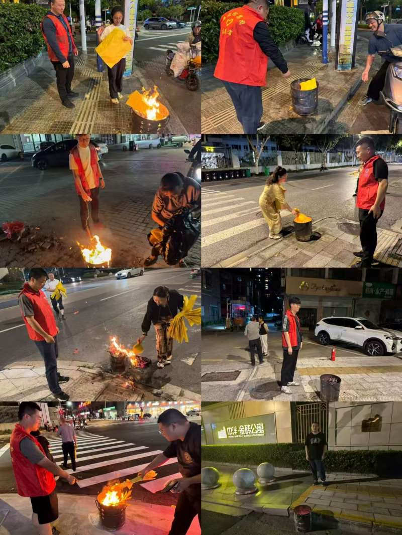 活动小结:1、活动主题:斋孤节焚烧引导志愿活动2、活动时间:2024年9月21日3、活动地点:安泰路4、参与对象:海投控集团员工5、活动内容:9月21日(周日)为农历斋孤节,部分市民可能有焚烧纸钱、祈求平安的习俗。根据以往做法,(9月21日晚6:30-8:30)在管理的路段合理设置铁皮桶,安排志愿者(着志愿者服装)引导群众有序焚烧纸钱。6、活动效果:本次活动,在集团领导的大力支持和集团员工的共同参与配合下,开展的顺利、圆满、成功,收到了预想效果。焚烧纸钱集中到焚烧桶内,过程中井然有序,未有明火外泄,导致安全隐患。