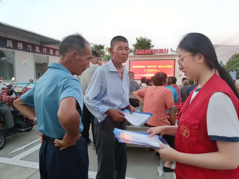 为弘扬乡土文化,丰富村民精神生活,近日,周桥村新时代文明实践站组织了一场“万里千家”惠民文艺演出。这场演出充满乡土气息,为周桥村的“夜生活”悄然注入了别样活力。暮色初临时,暑气渐消,文化广场周围,挤满了闻讯而来的村民。随着《中华全家福》歌舞声响起,演出正式开场。节目精彩纷呈,既有活力四射的广场舞,又有村民耳熟能详的经典歌曲;既有反映乡村新变化的小品,又有韵味十足的地方戏曲。每个节目都紧扣农村生活,带着浓浓的乡土味,让台下观众看得津津有味,不时响起阵阵掌声和喝彩声。借着演出的契机,志愿者们顺势铺开了一场别开生面的反诈宣传。他们穿梭在围观的村民中间,把电信网络诈骗的那些“猫腻”拆解得明明白白。从看似能轻松赚钱的网络刷单、吹得天花乱坠的虚假投资,到假装客服要给你退款的“好事”、打着交友旗号设下的圈套,再到冒充公检法人员耍的“威风”,这些常见的骗局套路,都被志愿者们一个个拎出来,掰开揉碎地讲清了里面藏着的坑。