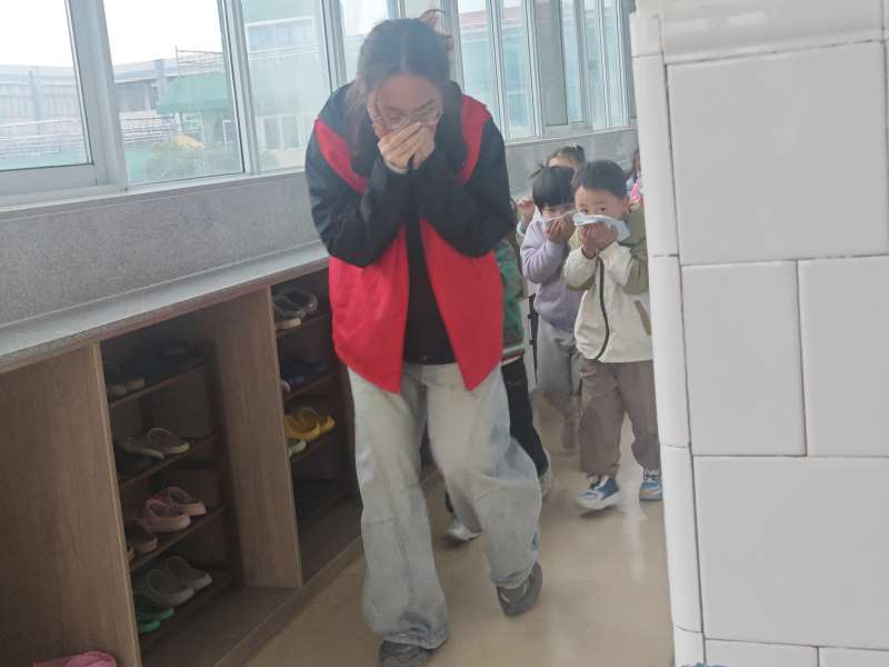 7日上午,各班进行消防安全教育,引导幼儿了解防火知识,知道着火了怎么办等等。上午9点40分,开始演练准备活动,各岗位人员到位检查情况,副总指挥通过广播强调演练要求。10点整,演练活动开始,警报声鸣响,各班老师清点人数并按疏散路线撤离。在各楼层疏散引导员和各班教师的带领下,按照指定的疏散路线,幼儿各自手拿毛巾,捂住口鼻,弯下腰,有序的一个接一个迅速向外撤离。最后历时将近3分钟,全体人员安全撤离到了后操场。
