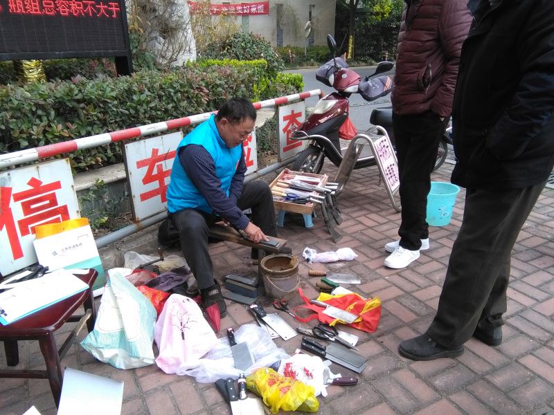 “12.5”国际志愿服务日快到了。志愿者们各显神通,这不,大爷们把磨刀的工具翻了出来,给社区居民免费磨刀。经过网络宣传,居民们络绎不绝地走来,居然还排起了退伍。夜幕降临的时候,大爷们的刀还没有磨完。志愿者们决定给每把刀贴上标签,写上楼号名字。晚上回家继续磨,居民们隔天再来领取。