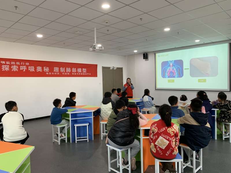 为引领青少年了解人体器官的形态和功能,带领学生体验生命的奥秘。3月1日下午,海安市科协、科技馆开展了以“探索呼吸奥秘 趣制肺部模型”为主题的科普周讲堂活动。活动伊始,科普老师在课堂上绘声绘色地讲解肺部结构与作用等知识,让学生对人体肺部有了更直观、深入的认识。手工制作现场,孩子们用塑料模拟气管连接气球模拟肺,一个个肺呼吸模型在大家手中诞生。通过小小的模型,孩子们清楚地了解到人体肺部运行机理。这场模拟肺科技手工制作活动,恰似一场知识与趣味交织的盛宴,在探索人体奥秘的路上,为同学们点亮一盏创意明灯,助力他们逐光前行,期待未来他们解锁更多生命密码!