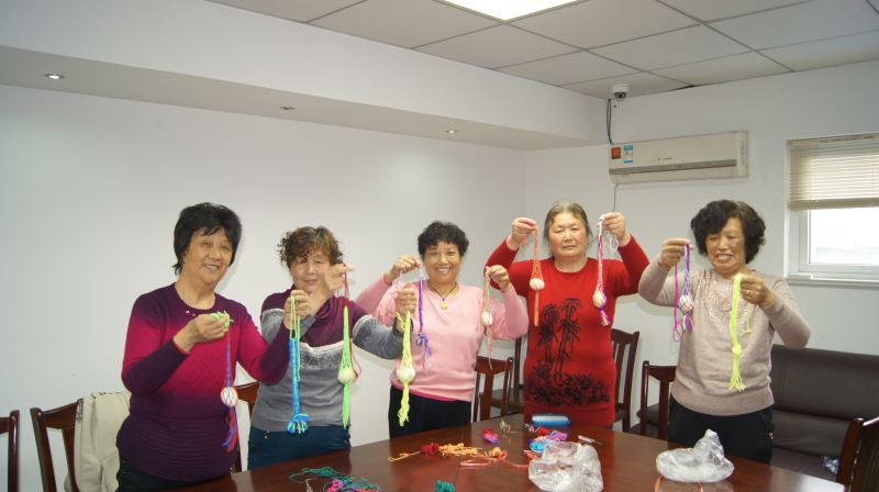 社区为大家准备了几十条五彩绒线,大家挑选好绒线后就开始编织起来。他们先将两股绒线编织成粗一点的彩绳做为挂绳,另外几根同样长度的绒线穿进挂绳用来编网,然后将相邻的两根线打结,打结的长度要一致,以此类推,成了环状,扎了五六层后,将线尾扎起,一个镂空的蛋兜就编织成了。大家一边编织,一边还聊着家常,现场不时传来欢声笑语,气氛很是融洽,看着五彩斑斓的蛋兜,大家脸上洋溢着幸福的笑容。蛋兜编织好后,经过大家的相互投票,选出了最美蛋兜。