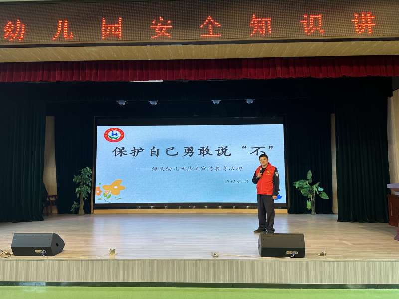 幼儿园是孩子们快乐成长的摇篮,园所安全牵动着老师和家长们的心。为进一步增强幼儿安全防范意识,保障幼儿身心健康,提高自我保护能力,10月27日上午,海南幼儿园邀请法治副校长周顺锋开展了“保护自己 ,勇敢说不” 安全知识专题讲座活动,责任督学胡桂年参加了此次活动。 周警官围绕“保护自己的隐私”这一主题,结合幼儿的年龄特点,通过绘本故事和简单易懂的画面,分别从认识隐私部位、怎样辨别坏人、如何识别坏人的“坏行为”以及当碰到坏的行为时我们应该要有五种危险警报等方面帮助幼儿初步建立身体隐私部位的概念,知道隐私部位不能随便让别人看、摸,也不能随便摸别人的身体,学会保护自己,尊重别人。互动环节时,周警官通过提问进一步帮助孩子们懂得如何保护自己的身体,建立警觉性,既增强了幼儿的学习趣味,又调动了他们的积极性,使其变被动接受为主动学习,从而提高孩子们的自我保护意识。 活动中,周警官还为我们普及了“预防校园隐性欺凌”安全小知识,在与孩子们交流、讨论的过程中,帮助幼儿了解和识别欺凌、暴力行为,使小朋友知道了在日常生活中,如果与同伴间发生一点小矛盾、小纠纷时,该如何正确的解决,并通过儿歌的形式引导幼儿,伙伴之间要友好相处。 危险是潜在的,而预防是最有利的武器。海南幼儿园将进一步强化法治进校园工作力度,扎实开展法治安全教育活动,提高全体师生的安全防范意识,把法治安全教育融入幼儿的一日生活当中,为孩子们布好全方位的安全防护网。