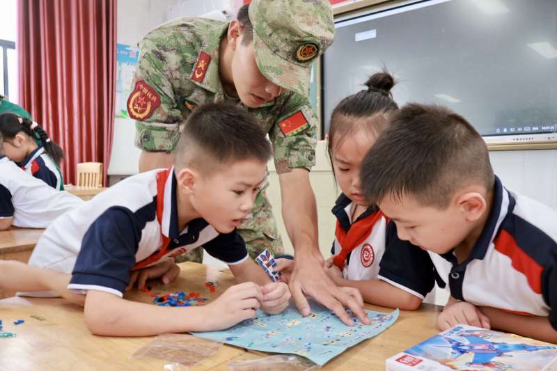 为将国防教育融入校园,引导青少年传承红色基因,石港镇走进石港小学,结合“全国科普月”,开展 “弘扬抗战精神 共筑国防长城” 主题活动,让学生在互动体验中种下爱国强军的种子。活动伊始,志愿者用动画短片和趣味问答开场,以 “什么是国防” 为切入点,向同学们讲解国防是保护国家和人民的 “安全铠甲”。随后,通过我国军事装备发展的复兴之路,生动地讲述新中国成立后我国国防事业的发展历程。为让国防教育更具趣味性和参与感,活动设置了多个互动实践环节,让同学们在 “玩中学、学中悟”。在 “国防知识问答竞赛” 中,各小组选手围绕抗战历史、国防政策、军事常识等题目展开激烈角逐。“东风导弹拼图” 环节则让同学们在动脑动手中近距离感受国防科技的魅力。最后,退役军人带领同学们来到操场上进行军体拳训练,“弓步冲拳”“马步横打”,大家学得有模有样,喊着口号,气势十足;叠军被环节,退役军人现场演示 “豆腐块” 叠法,手把手教大家压被、折角,同学们认真摆弄着小被子,虽然叠得不够整齐,却满脸成就感。