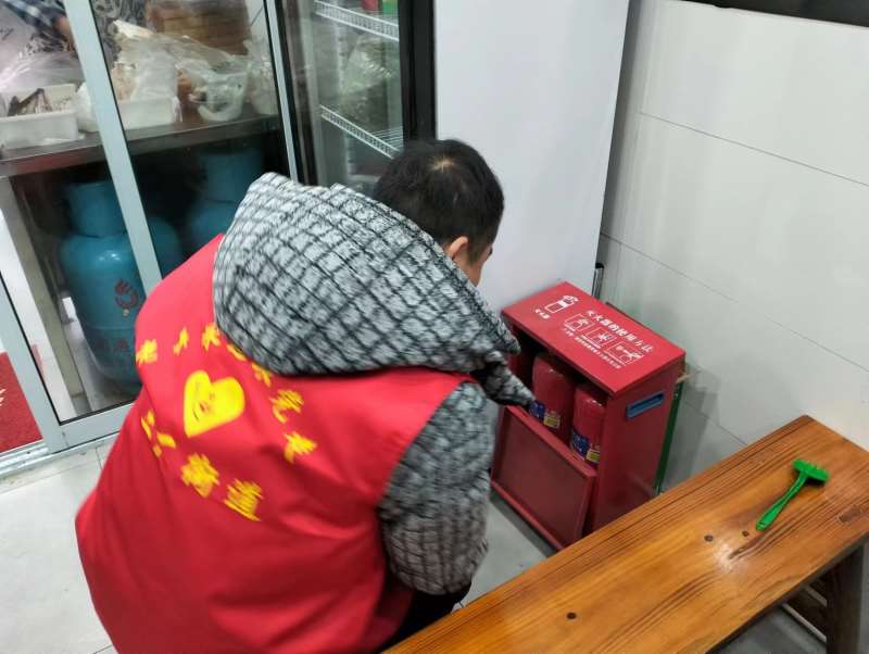 为保障辖区消防安全,新东街社区组织志愿者检查沿街商铺的消防设施。