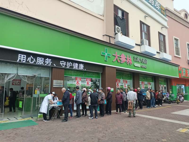 携手江海大药房为居民免费提供测量血压、按摩、艾灸等公益服务项目