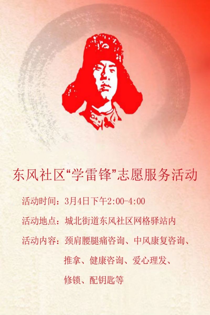城北街道东风社区志愿服务进社区 集合时间:3月4日下午1点45分 集合地点:城北街道东风社区网格驿站(环西大桥北红绿灯西雍景学府西隔壁) 活动联系人:季晓光13951414182