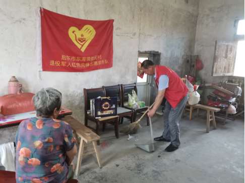 建民村红色志愿服务队组织退役军人到烈士子女家打扫卫生,施玉群丧偶,儿子已故,家庭经济较困难,加上年级较大,自理能力较差,于是退役军人施天兵等来到她家帮助其家里打扫卫生,关心其她的身体状况并告知她有时找村委会帮忙